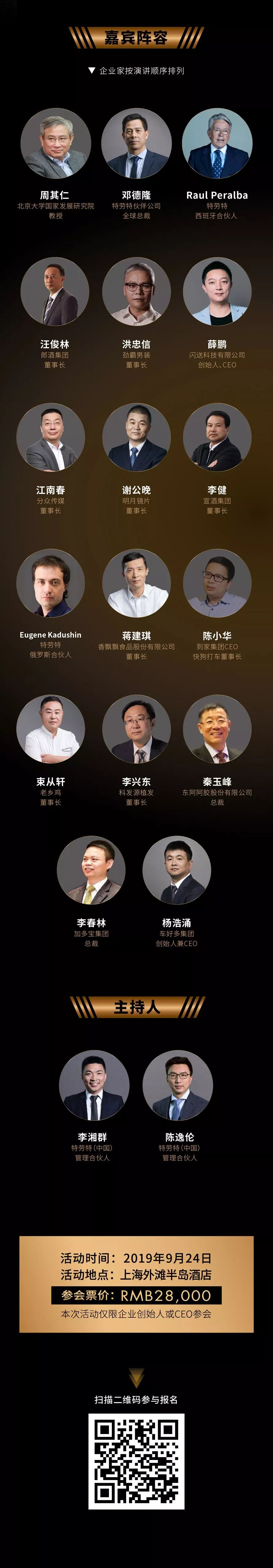 郎酒集团董事长汪俊林、加多宝集团总裁李春林、车好多集团创始人兼CEO杨浩涌、香飘飘食品股份有限公司董事长蒋建琪、分众传媒董事长江南春、劲霸男装董事长洪忠信、东阿阿胶股份有限公司总裁秦玉峰、快狗打车董事长兼到家集团CEO陈小华、闪送创始人兼CEO薛鹏等十多位运用和实践定位的企业家将深度分享他们的战略之道。