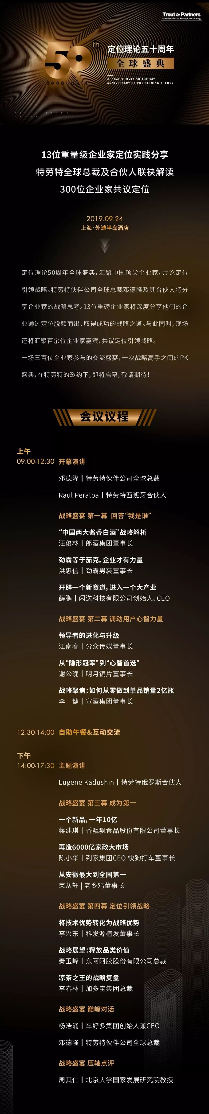 2019年9月24日,“定位理论五十周年全球盛典”, 一次意义非凡的战略盛宴。届时,北京大学国家发展研究院教授周其仁、特劳特伙伴公司全球总裁邓德隆将做精彩演讲及点评。