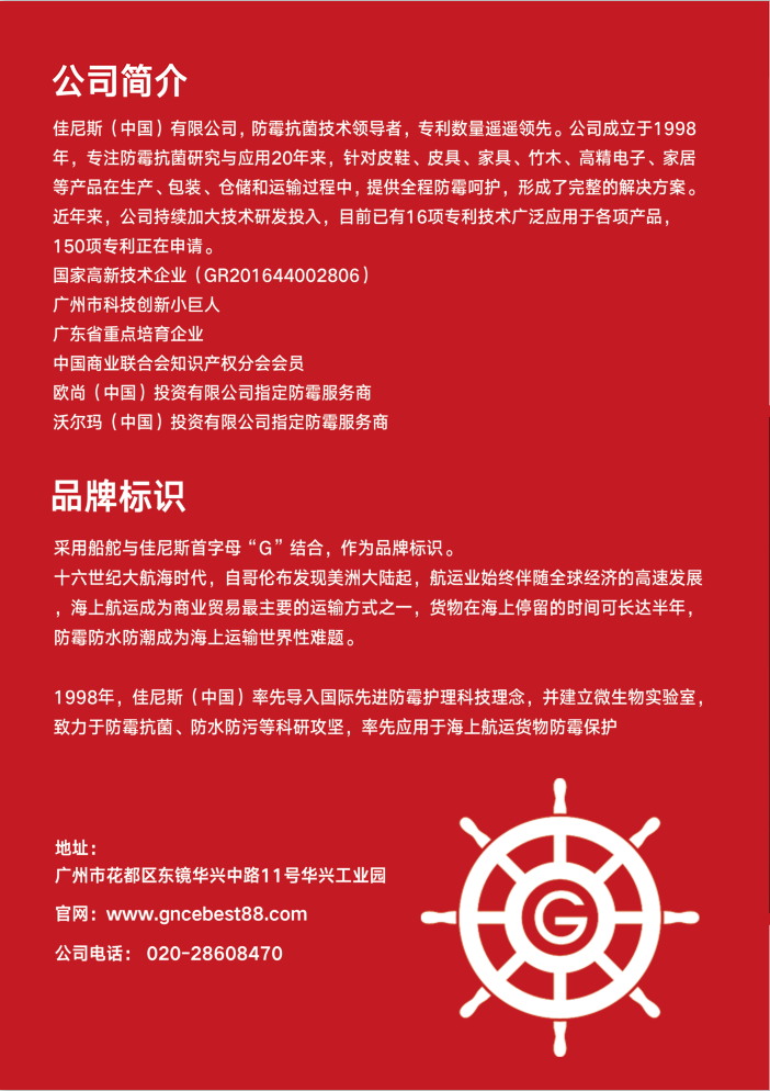 佳尼斯公司成立于1998年,十大全球领先品牌指定防霉供应商。国家高新技术企业,广州科技小巨人,广东省重点培训企业。公司正在导入定位战略,以里斯品类战略、定位理论梳理发展方向,建立竞争优势。