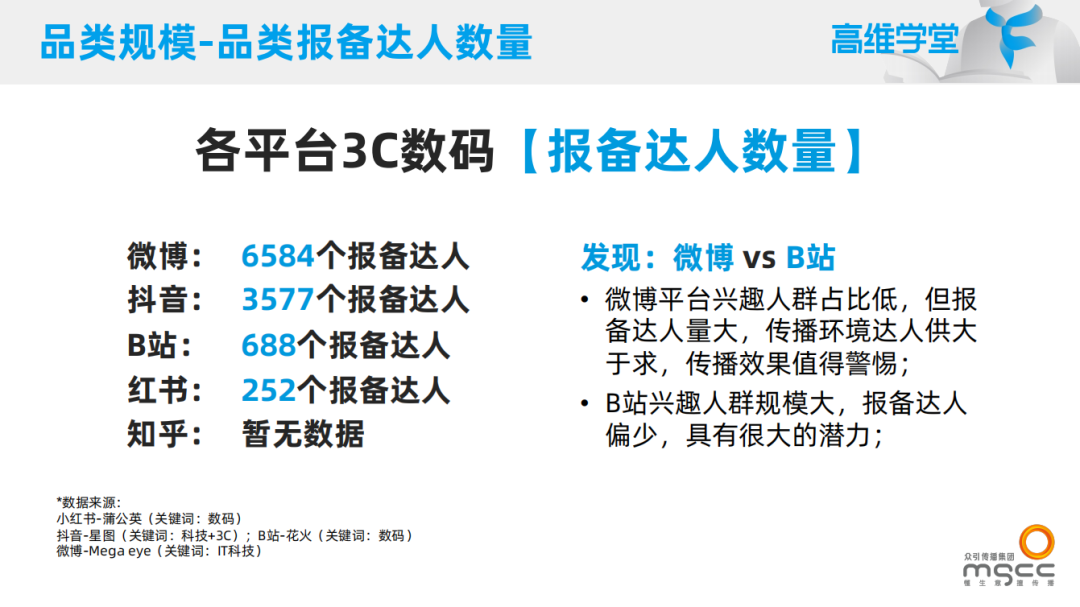微博虽然人群的体量不大,人群的浓度最低,但是微博上却有着最多的3C品类报备达人,他有6000多个,而B站只有600多人。
