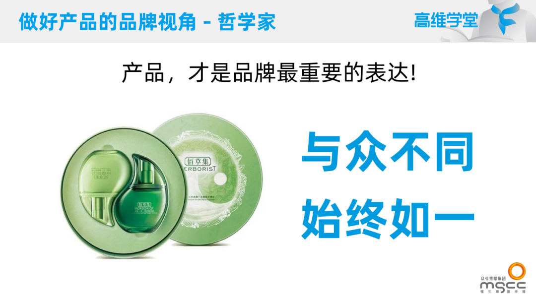 佰草集的定位是以中国草药为核心的品牌,通过广告去呈现这个理念,还不如做出这样的产品来。就是雅诗兰黛这样的大品牌也没法做的,这就是产品才是品牌最重要的外在表达,这就是品牌的个性。