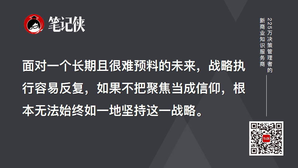 面对一个长期且很难预料的未来,战略执行容易反复,如果不把聚焦当成信仰,根本无法始终如一地坚持这一战略。